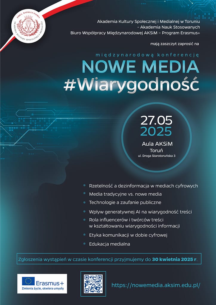 Akademia Kultury Społecznej i Medialnej w Toruniu od 2016 roku organizuje cykliczną międzynarodową konferencję poświęconą tematowi nowych mediów. W roku 2025 chcemy poświęcić szczególną uwagę wiarygodności oraz współczesnym wyzwaniom, które stoją przed użytkownikami w związku z odpowiedzialnym korzystaniem z technologii cyfrowych. Nowe media kształtują współczesne sposoby komunikacji, konsumpcji treści i postrzegania rzeczywistości. W dobie dezinformacji, fake newsów i algorytmicznej manipulacji, kwestia wiarygodności przekazu staje się kluczowym wyzwaniem. Konferencja „#Wiarygodność” stawia sobie za cel refleksję nad rzetelnością informacji, strategiami ich weryfikacji oraz rolą technologii w procesach budowania (lub podważania) zaufania w przestrzeni cyfrowej. Główne obszary tematyczne: